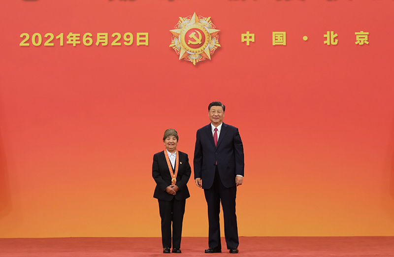 6月29日,慶祝中國(guó)共產(chǎn)黨成立100周年“七一勛章”頒授儀式在北京人民大會(huì)堂金色大廳隆重舉行。中共中央總書記、國(guó)家主席、中央軍委主席習(xí)近平向“七一勛章”獲得者馬毛姐頒授勛章。新華社記者 李學(xué)仁 攝