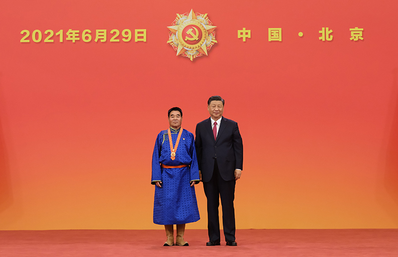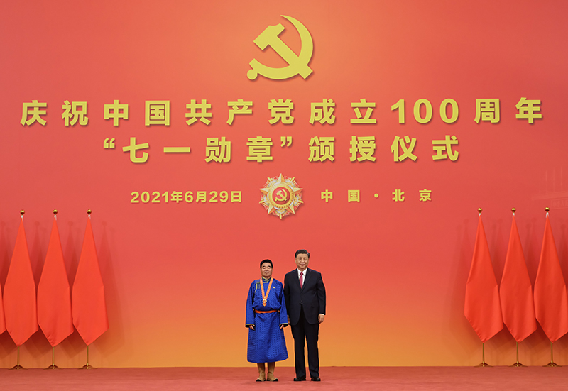 6月29日,慶祝中國(guó)共產(chǎn)黨成立100周年“七一勛章”頒授儀式在北京人民大會(huì)堂金色大廳隆重舉行。中共中央總書記、國(guó)家主席、中央軍委主席習(xí)近平向“七一勛章”獲得者廷·巴特爾頒授勛章。新華社記者 李學(xué)仁 攝