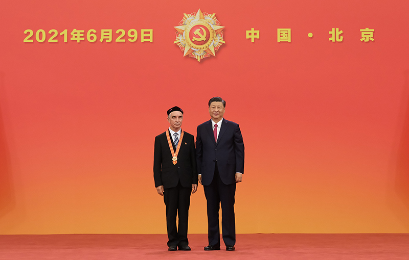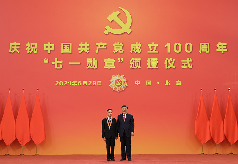 6月29日,慶祝中國(guó)共產(chǎn)黨成立100周年“七一勛章”頒授儀式在北京人民大會(huì)堂金色大廳隆重舉行。中共中央總書記、國(guó)家主席、中央軍委主席習(xí)近平向“七一勛章”獲得者買買提江·吾買爾頒授勛章。新華社記者 李學(xué)仁 攝
