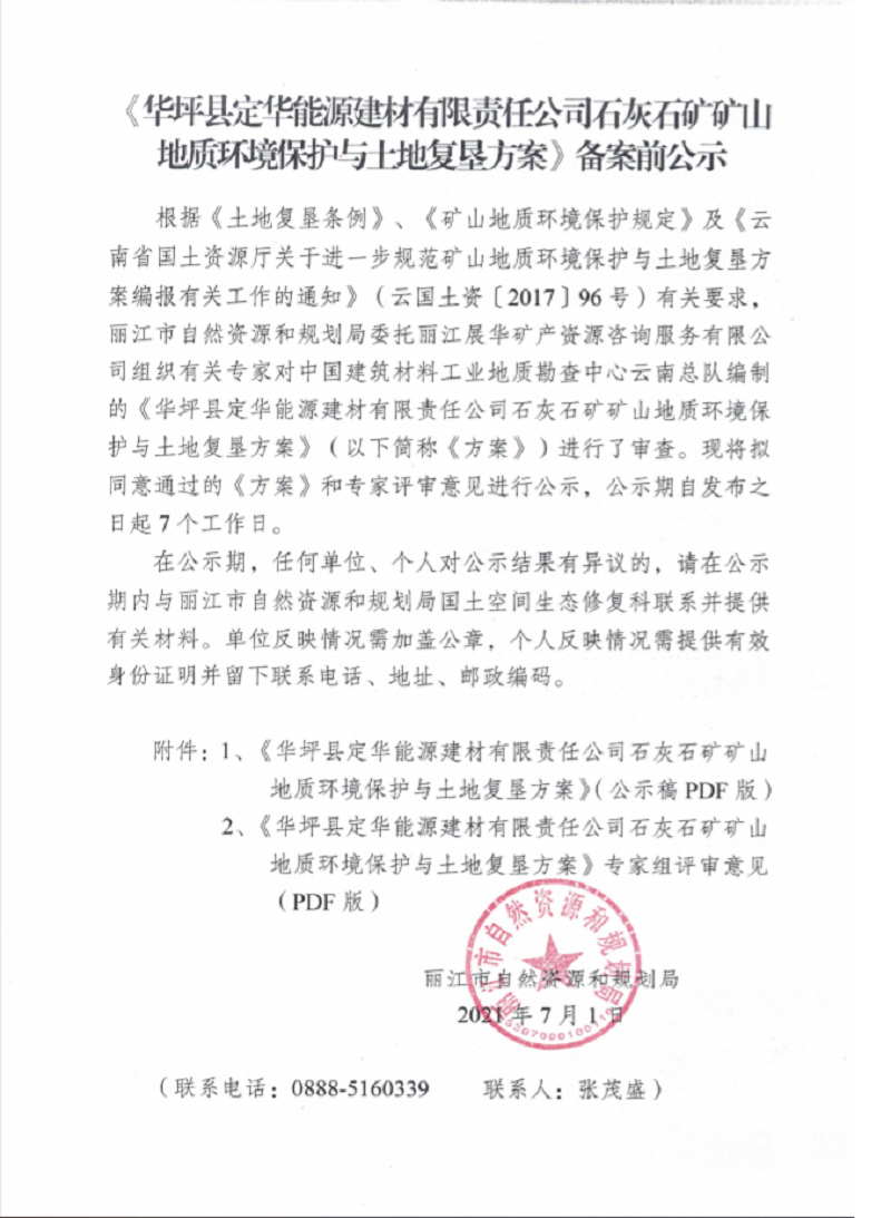麗江市華坪縣定華能源建材有點責(zé)任公司石灰石礦恢復(fù)治理及土地復(fù)墾方案
