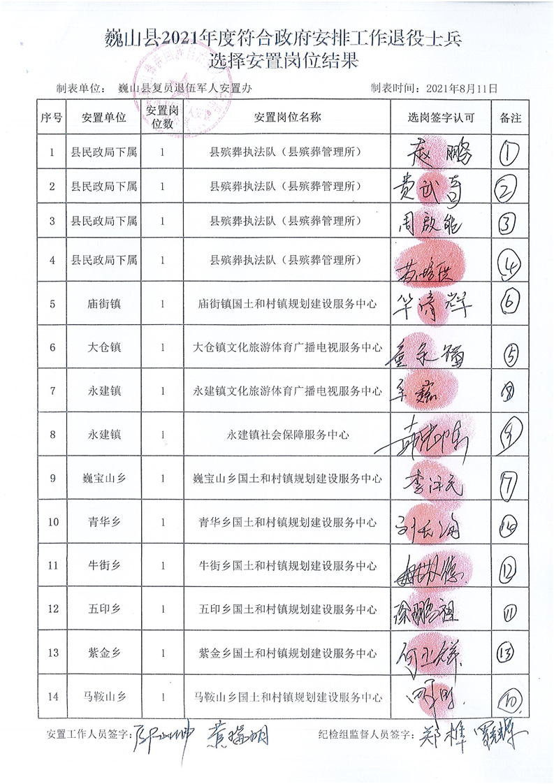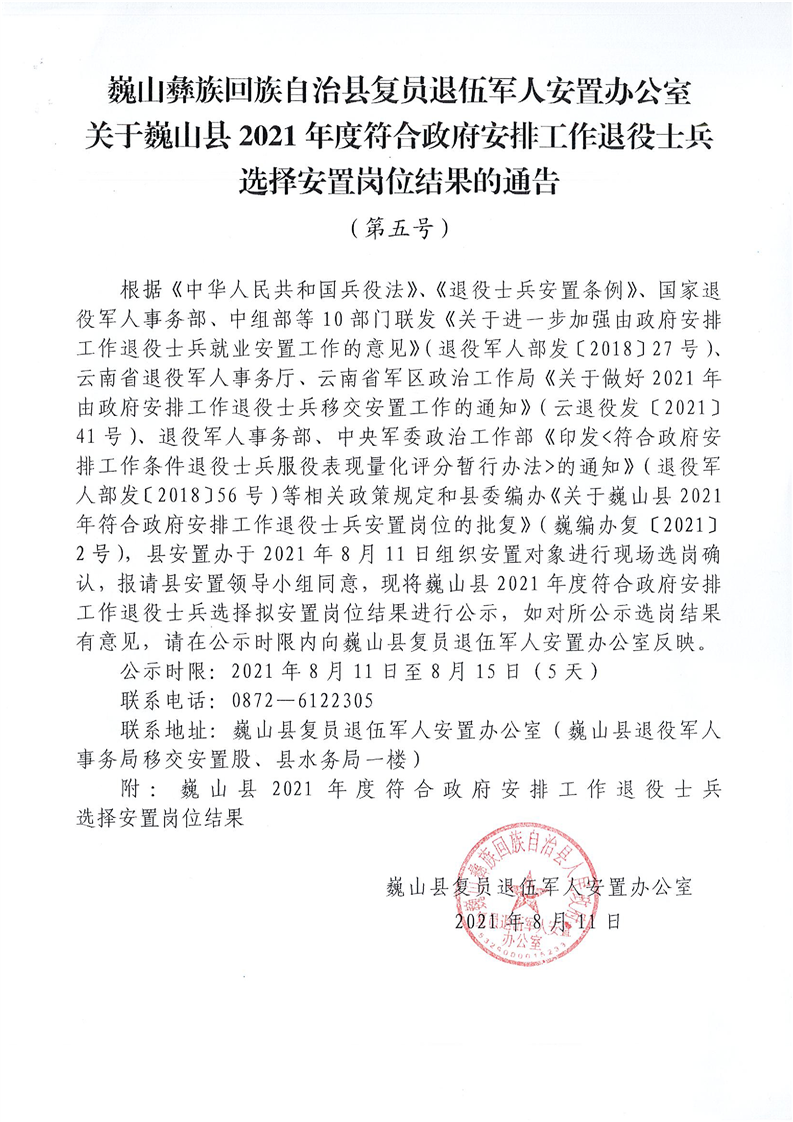 大理市巍山彝族回族自治縣復(fù)員退伍軍人安置辦公室關(guān)于巍山縣2021年度退役士兵崗位安置結(jié)果公示