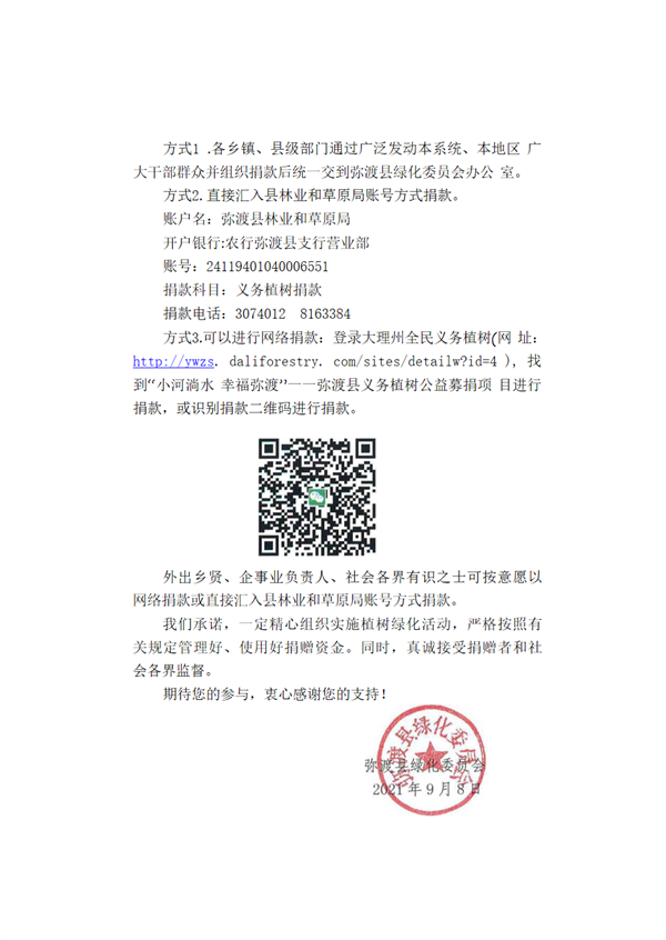 大理市彌渡縣2021年義務植樹活動募捐倡議書