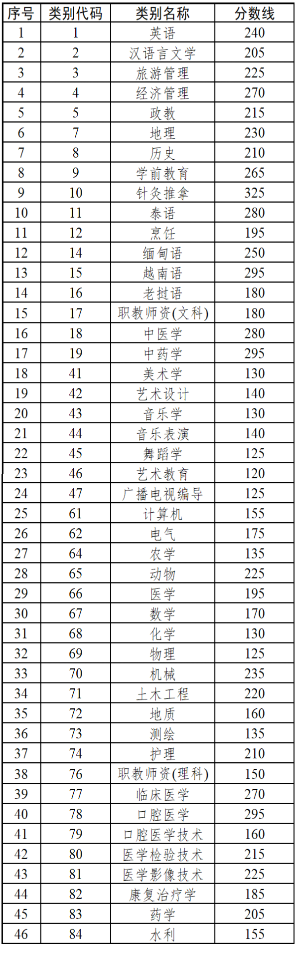 云南省2022年普通高等學(xué)校本科招收應(yīng)屆?飘厴I(yè)生升學(xué)統(tǒng)一考試各專業(yè)類別分?jǐn)?shù)線