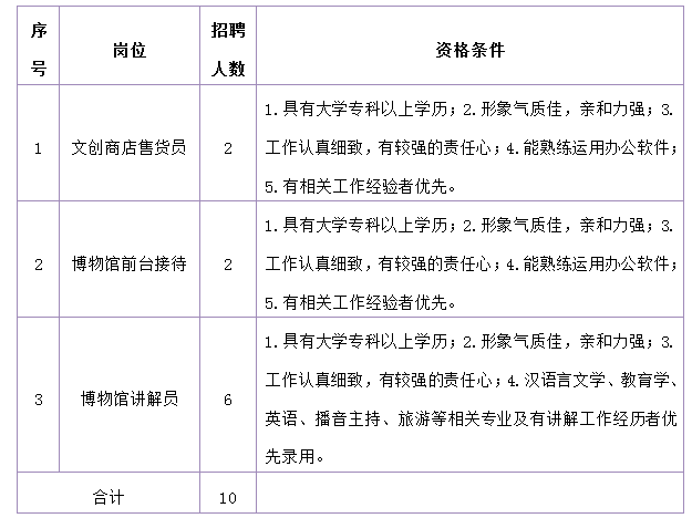 本次共招聘10名。其中,文創(chuàng)商店售貨員2名,博物館前臺接待2名,博物館講解員6名。應聘人員在符合招聘基本條件基礎上,需符合以下相關崗位資格條件。具體崗位條件如下: