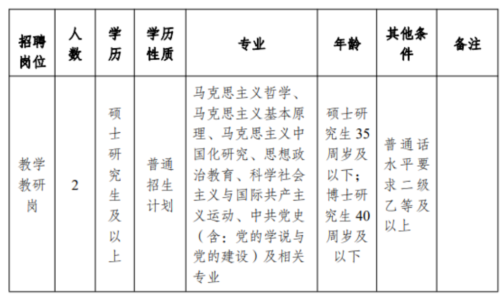 本次招聘崗位為楊善洲干部學(xué)院事業(yè)編制內(nèi)教師崗位,招聘人數(shù)2人,專(zhuān)門(mén)從事楊善洲干部學(xué)院教學(xué)和教研工作,參與課程、課件、教材和現(xiàn)場(chǎng)教學(xué)點(diǎn)的開(kāi)發(fā)與研究,承擔(dān)培訓(xùn)班的授課任務(wù)等具體工作,崗位要求如下: