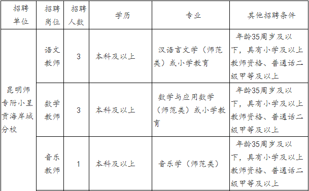 呈貢分校2019年招聘教師均為民辦教師(無(wú)公辦編制),教師工資不低于公辦學(xué)校教師水平。具體招聘崗位如下: