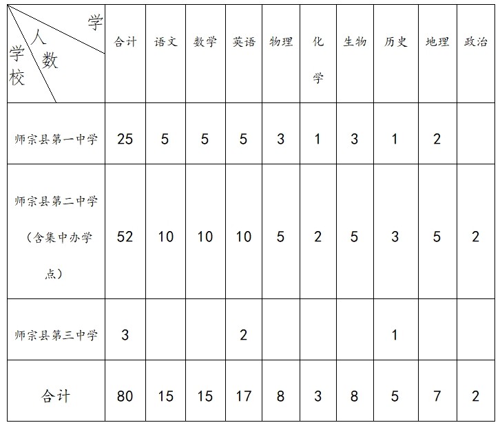 為加強(qiáng)師宗縣教師隊(duì)伍建設(shè),經(jīng)縣委、縣政府同意,曲靖市師宗縣教育體育局決定面向全國師范大學(xué)類本科大學(xué)(不包含師范類學(xué)院)(名單見附件1)2020年畢業(yè)的優(yōu)秀學(xué)生,公開招聘中學(xué)教師80名,現(xiàn)公告如下。